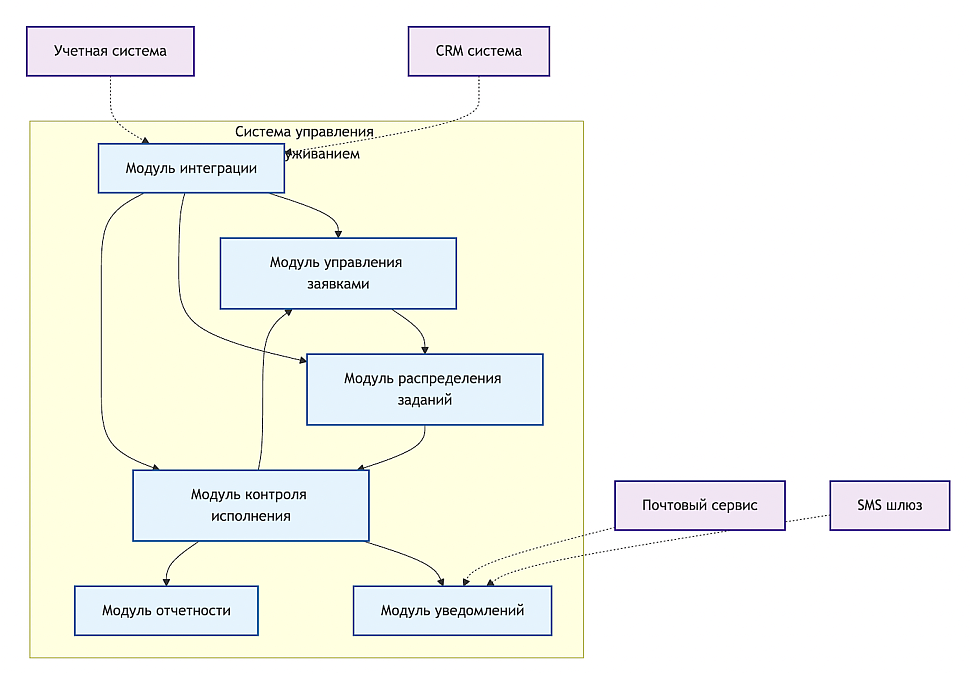 - Модуль интеграции — взаимодействие с существующими системами организации (CRM, учетная система)
